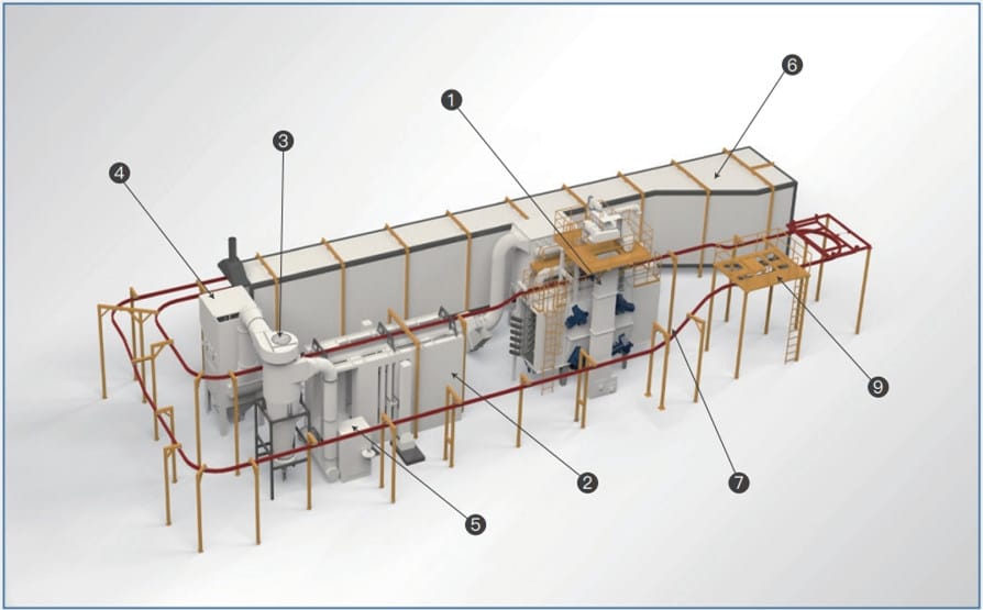 ⑥ Curing oven system: Delivers precise temperature control to solidify coatings into durable, smooth finishes.